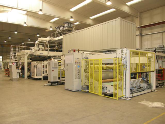 The test-run of our line DIAPERCAST® for the manufacturing of cast embossed film for hygienic and diapers field is taking place in these days. It is a line of highest technology, the quickest available on the market as it reaches a production speed of 400 m/min. The line has a useful width of 2000 mm and grants a net production of 960 kg/h considering a film thickness of 20µ. The line is equipped with 3 extruder, automatic extrusion die as well as 5 layer feed-block Cloeren, gravimetric dosing system with 18 components, 6 for each extruder, thickness measurer, single face corona treatment and winder for reels dia. 600 mm. The line allows to realize 20 in-line cuttings for the production of 19 finished reels. The added value of this line lays in the cooling system on the rubber coated pressure roller which is realized with a dry technology and not a water bath one, avoiding in this way the problem standing out from this last technology. The line will be presented in Open House on February 24 and 25 at our facilities in Novara in order to allow to anybody is interested to appreciate the characteristics of this innovative plant. For any further details please do not hesitate to contact us.